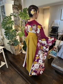 大学の卒業式にご出席されるお嬢様のお着付けの担当をさせて頂きました 大きい柄の お振袖 若さが輝いて とっても綺麗です 楽しい一日をお過ごし下さいね ご来店ありがとうございました